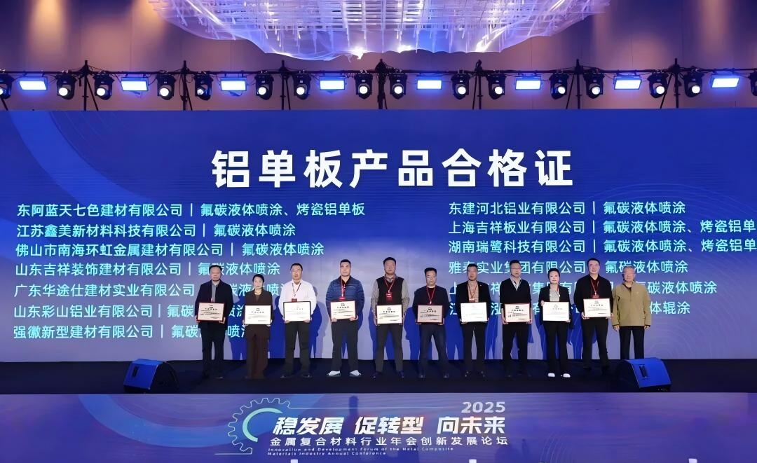 雅泰實(shí)業(yè)集團(tuán)參加本次年會(huì),會(huì)上,集團(tuán)的氟碳液體噴涂鋁單板、不燃級(jí)鋁復(fù)合板、鋁波紋芯復(fù)合鋁板等產(chǎn)品分別榮獲“新國標(biāo),高質(zhì)量”產(chǎn)品合格證。