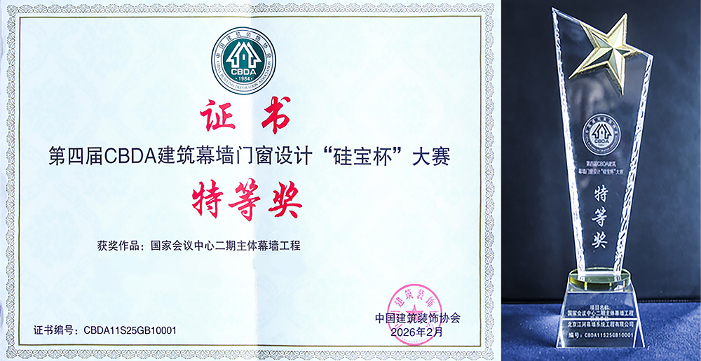 國(guó)家會(huì)議中心二期主體幕墻工程榮獲第四屆CBDA建筑幕墻門窗“硅寶杯”設(shè)計(jì)大賽特等獎(jiǎng)