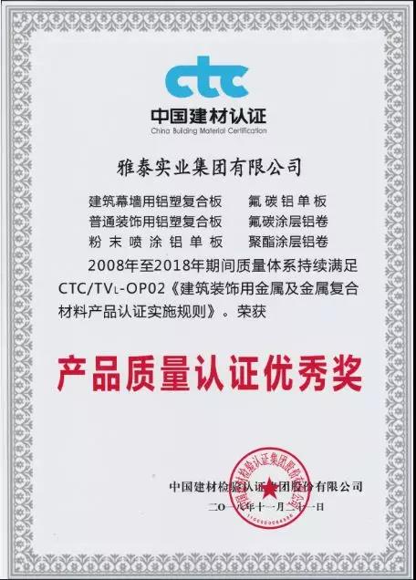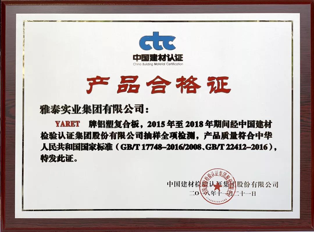 會(huì)上,雅泰產(chǎn)品憑借2008年至今2018年期間質(zhì)量體系持續(xù)滿足CTC/TVL-OP02《建筑裝飾用金屬及金屬復(fù)合材料產(chǎn)品認(rèn)證實(shí)施規(guī)則》,榮獲2018年度CTC產(chǎn)品質(zhì)量認(rèn)證優(yōu)秀獎(jiǎng)。YARET牌鋁塑復(fù)合板,2015年至2018年期間經(jīng)中國建材檢驗(yàn)認(rèn)證集團(tuán)股份有限公司抽樣全項(xiàng)檢測(cè),產(chǎn)品質(zhì)量符合中華人民共和國國家標(biāo)準(zhǔn)(GB/T 17748-2016/2008、GB/T22412-2016),被授予2018年度產(chǎn)品合格證。