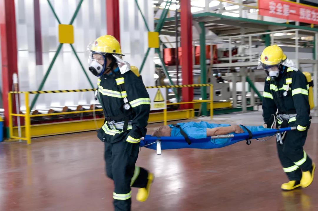 活動(dòng)中,其應(yīng)急演練模擬場景以兩名員工經(jīng)過車間2#涂裝線RTO(廢氣處理設(shè)施)設(shè)備處,聽到檢查平臺上有的異響聲,員工登上RTO檢查平臺查看,登上平臺發(fā)現(xiàn)管路一處法蘭密封失效,天然氣從法蘭處大量泄漏,員工即試圖切斷泄漏法蘭前后處截止閥,操作不當(dāng)致靜電火花引起氣體燃燒。隨即兩人嘗試撲救火災(zāi)失敗,逃離過程中一名員工吸入大量天然氣暈倒在車間,另一名員工嘗試救助失敗后逃離車間展開現(xiàn)場逃生演習(xí)。員工在自救失敗后第一時(shí)間聯(lián)系車間主任,撥打119火警電話,同時(shí)啟動(dòng)車間現(xiàn)場處置方案,指示車間兩名救災(zāi)人員穿戴消防服和SCBA救助受困人員,指派兩名救災(zāi)人員關(guān)閉車間天然氣閥門,并組織4#廠房全部人員立即有序撤離。