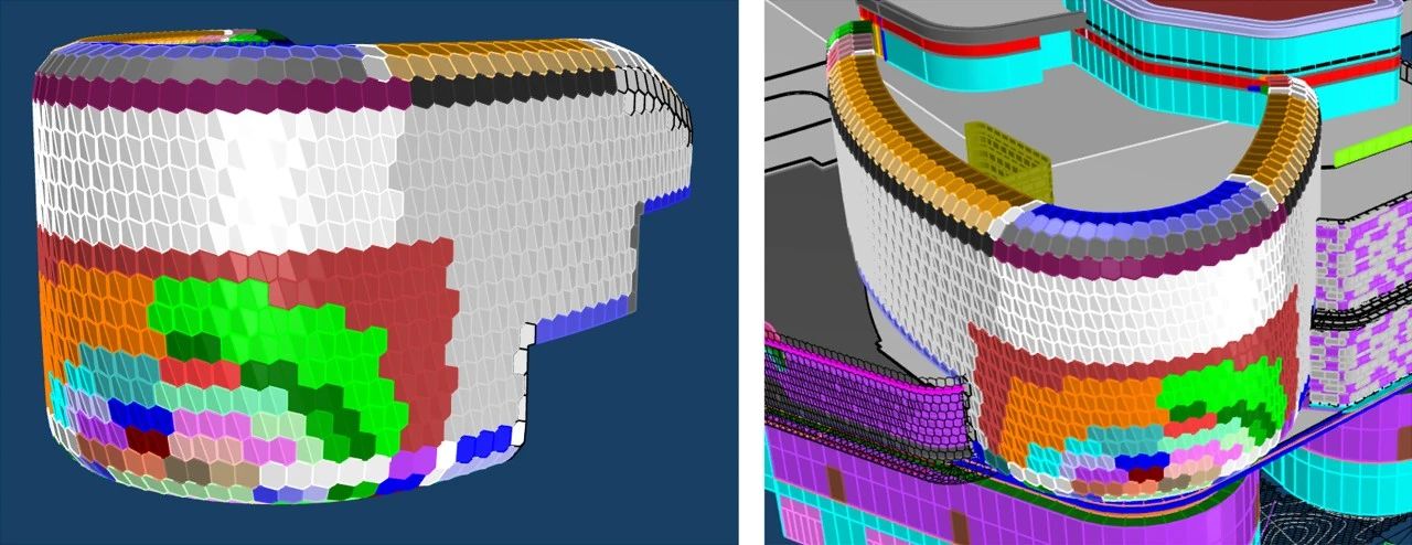南裙樓船頭造型內(nèi)部鋼結(jié)構(gòu)均有扭轉(zhuǎn),要求拐角幕墻呈現(xiàn)雙曲面效果;屋檐幕墻設(shè)計圍繞龍鱗造型,分解為單片“六邊形”元素展開,拐角弧度造型對鋁板制造及安裝工藝要求極高。