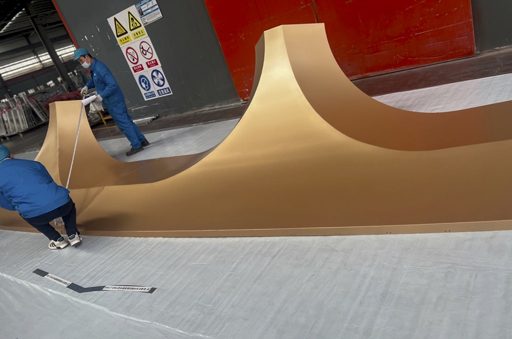 在華為練秋湖研發(fā)中心,為了研發(fā)人員有一個非常輕松愜意的工作與科創(chuàng)環(huán)境,每一個組團、每一棟單體都因各自功能性不同而被賦予不同的造型,所以幕墻的樣式也比較豐富。同時每一棟單體特色都以大板、大弧度的形式進行單獨或拼接展現,對于加工技術以及加工廠要求都比較高。為配合設計要求,雅泰集團積極開展項目專攻、技術探討、工藝培訓,大大提升了鋁幕墻板件的成型度和美觀性。