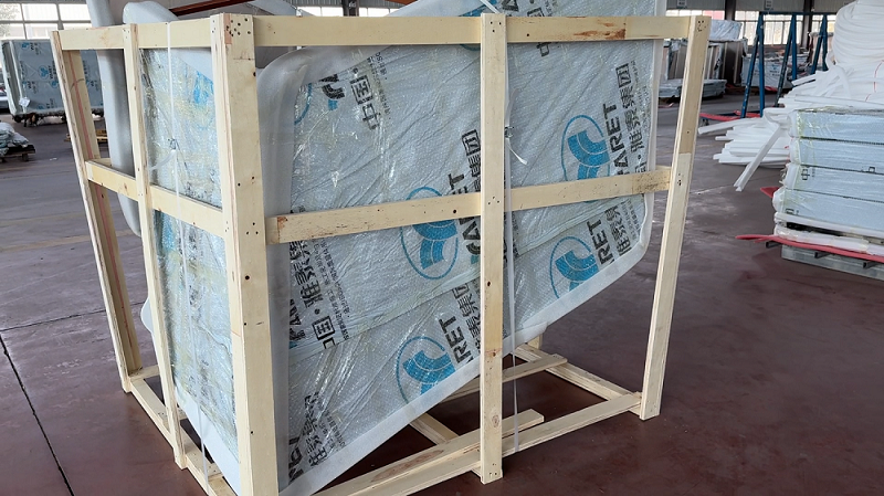 成品褶皺板經(jīng)檢驗合格后,分別用保護膜,外附加一層氣泡膜進行包裝防護。裝運時釘制專用木箱進行外圍運輸防護。