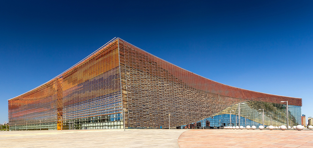 新疆克拉瑪依會展中心,1期(20,000平方米)和2期(40,000平方米)。1期會展廳可以被分隔為兩個各5,5000平方米的廳,公共大堂和廣場是室內(nèi)的,以響應(yīng)克拉瑪依寒冬氣候和盛行風(fēng)。1期的主大堂特意被做成超大尺寸以允許舉辦額外的超大展覽或為了滿足多個展覽的登記工作;1期大堂也通過人行天橋與2期連接。一個能夠容納超過300人的會議區(qū)域被置于大堂的上一層。